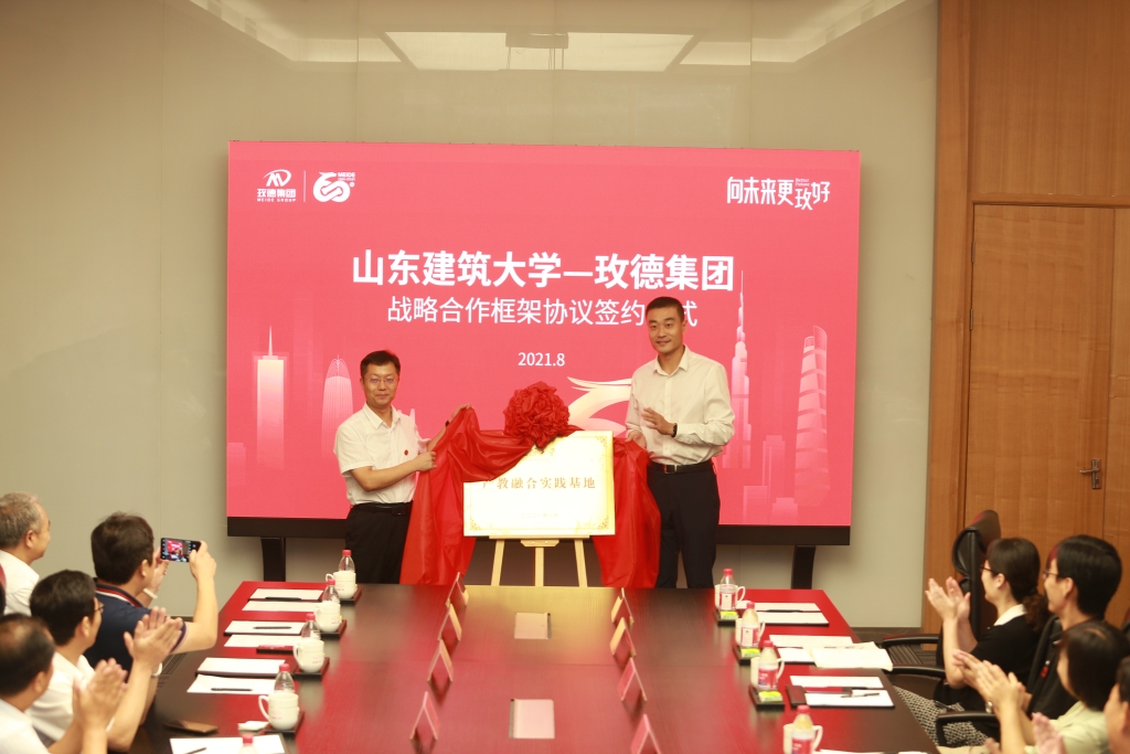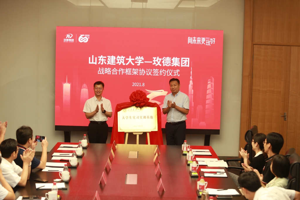 集团董事局主席孔令磊与山东建筑大学校长于德湖先后进行致辞,双方展望了校企合作的美好愿景,进行了深入沟通交流。校企双方签订了战略合作框架协议,并为在玫德集团设立的“山东建筑大学产教融合实践基地”和“山东建筑大学大学生实习实训基地”揭牌。