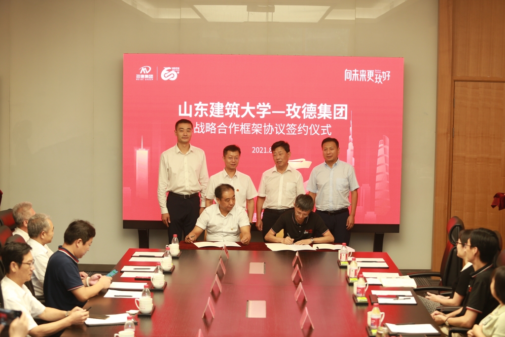 8月25日,山东建筑大学与玫德集团校企合作签约仪式在玫德集团本部举行,山东建筑大学党委副书记、校长于德湖,平阴县政府党组副书记范嘉池,平阴县委副书记赵治文,玫德集团董事局主席孔令磊,董事局副主席刘勇等出席签约仪式。