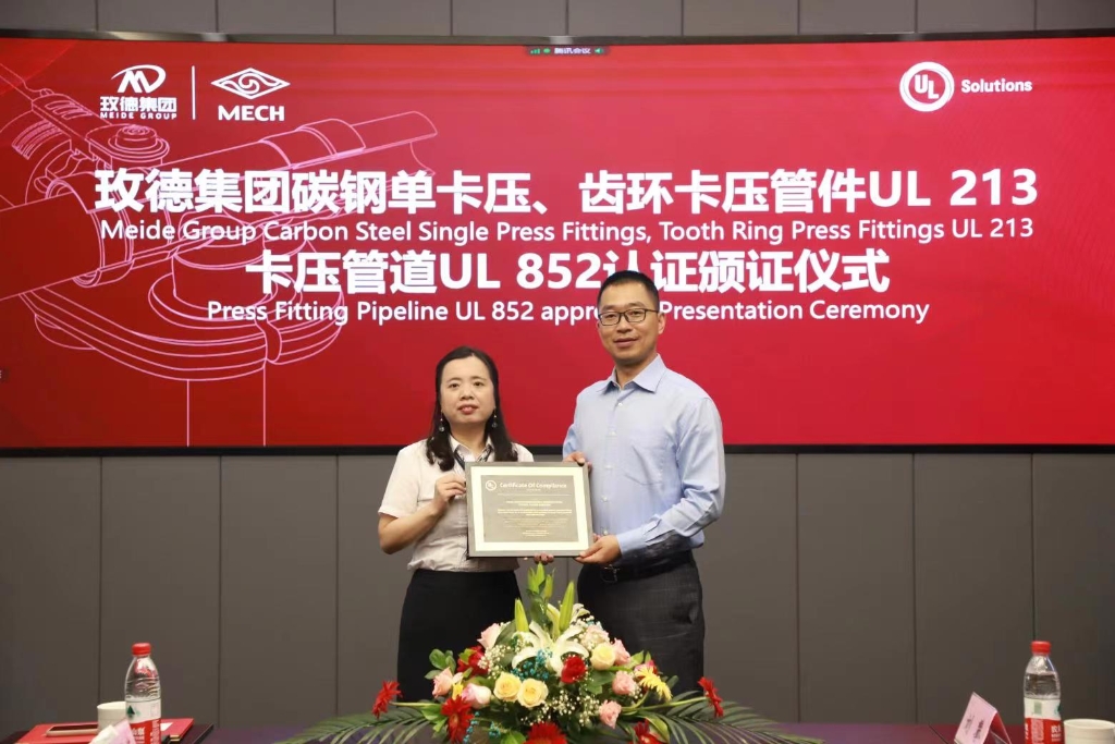 玫德雅昌(济南)管业有限公司获得国内首张卡压管件UL 213标准和卡压管道UL 852标准认证证书,7月15日,由UL Solutions为玫德雅昌颁发认证证书。UL Solutions建筑环境事业部亚洲区运营总监许洁,中国大陆及港澳地区销售经理李景云,高级客户经理羌金玉,玫德集团董事局副主席亓晓玉,玫德雅昌(济南)管业有限公司总经理田洪莲、副总经理刘攀双方管理层领导,以及来自马来西亚、菲律宾、新加坡、香港、台湾等国内外100多家客户现场和视频参加了颁证仪式。