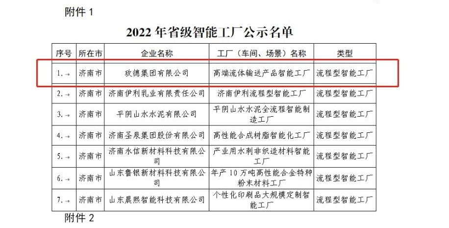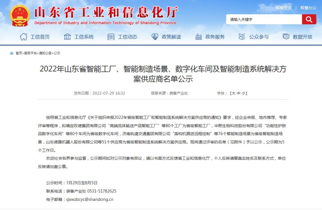 2022年7月29日,山东省工业和信息化厅发布“2022年山东省智能工厂、智能制造场景、数字化车间及智能制造系统解决方案供应商名单公示”, 玫德集团有限公司“高端流体输送产品智能工厂”入选省级智能工厂、自动化数字包装人机协同作业单元和智能仓储及精准配送制造两场景入选省级智能制造场景。智能工厂与智能制造场景的成功入选,是对集团推进玫德流程化、绿色化、智能化、数字化工厂建设成效的肯定,标志着玫德集团的智能制造水平已处于全省和行业领先位置。
