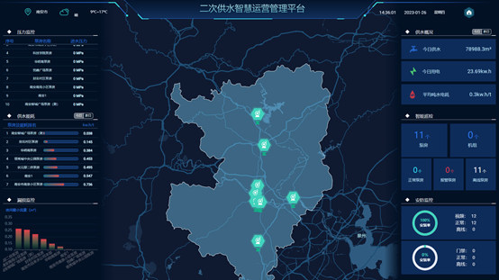 通过一张图可以实时监测泵房各项指标数据,将泵房能耗分析、二次供水压力分布、泵房异常预警报警、泵房巡检管理、二次供水设备信息等进行汇总展示及分析,实现二次供水的全方位监管监控,提高居民二次供水设施管理水平,改善供水水质和服务质量,促进节能降耗,加强治安防范,保障居民生活饮用水卫生安全及二次供水安全稳定运行。