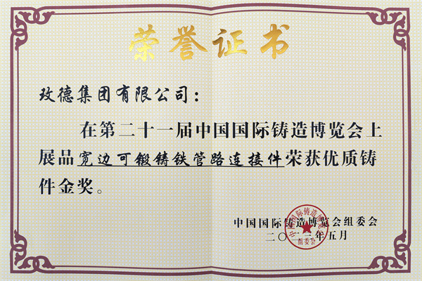玫德集团有限公司展品“宽边可锻铸铁管路连接件”荣获优质铸件金奖。