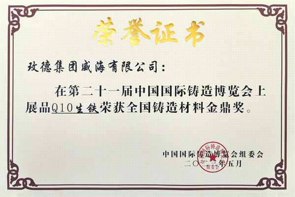 玫德集团威海有限公司展品“Q10生铁”荣获全国铸造材料金鼎奖。