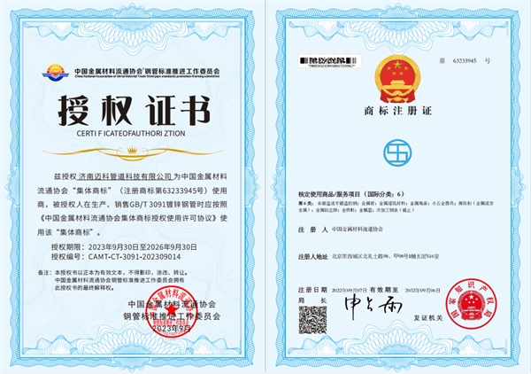 为了促进企业规范经营,维护国标产品形象和合规企业公信力、竞争力,保障用户合法权益,2023年3月15日,由中国金属材料流通协会焊管分会牵头,联合中国钢结构协会钢管分会、冶金工业信息标准研究院及国内主要焊管企业,正式启动了行业首个自律规范组织——中国金属材料流通协会钢管标准推进工作委员会(简称“中金协钢管标推委”),随后组织开展了GB/T 3091-2015产品认证工作。2023年10月16日,由四大权威机构联合发布的首批入围《执行GB/T 3091国家标准合规企业名录》的14家企业中,济南迈科管道科技有限公司成为首批执行GB/T3091国家标准并获得钢管标推委认证合规企业之一,同时获得中国金属材料流通协会授权使用“STS(钢管标准)”集体商标。