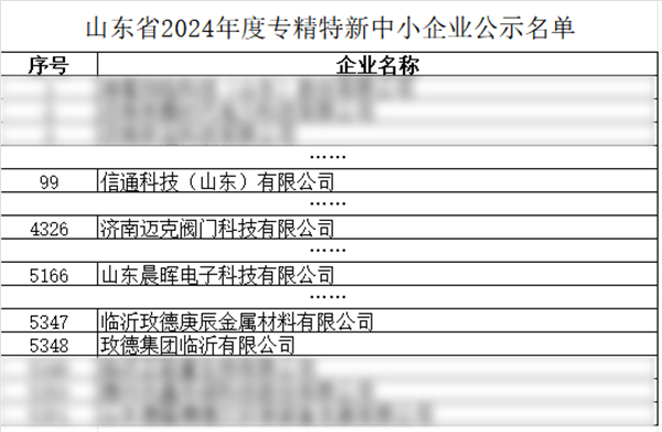 2024年5月28日山东省工业和信息化厅发布《山东省2024年度专精特新中小企业名单公示》通知,玫德集团旗下济南迈克阀门科技有限公司、山东晨晖电子科技有限公司、临沂玫德庚辰金属材料有限公司、玫德集团临沂有限公司顺利通过2024年度山东省“专精特新”中小企业复核,玫德集团旗下信通科技(山东)有限公司首次通过2024年度山东省“专精特新”中小企业认定。